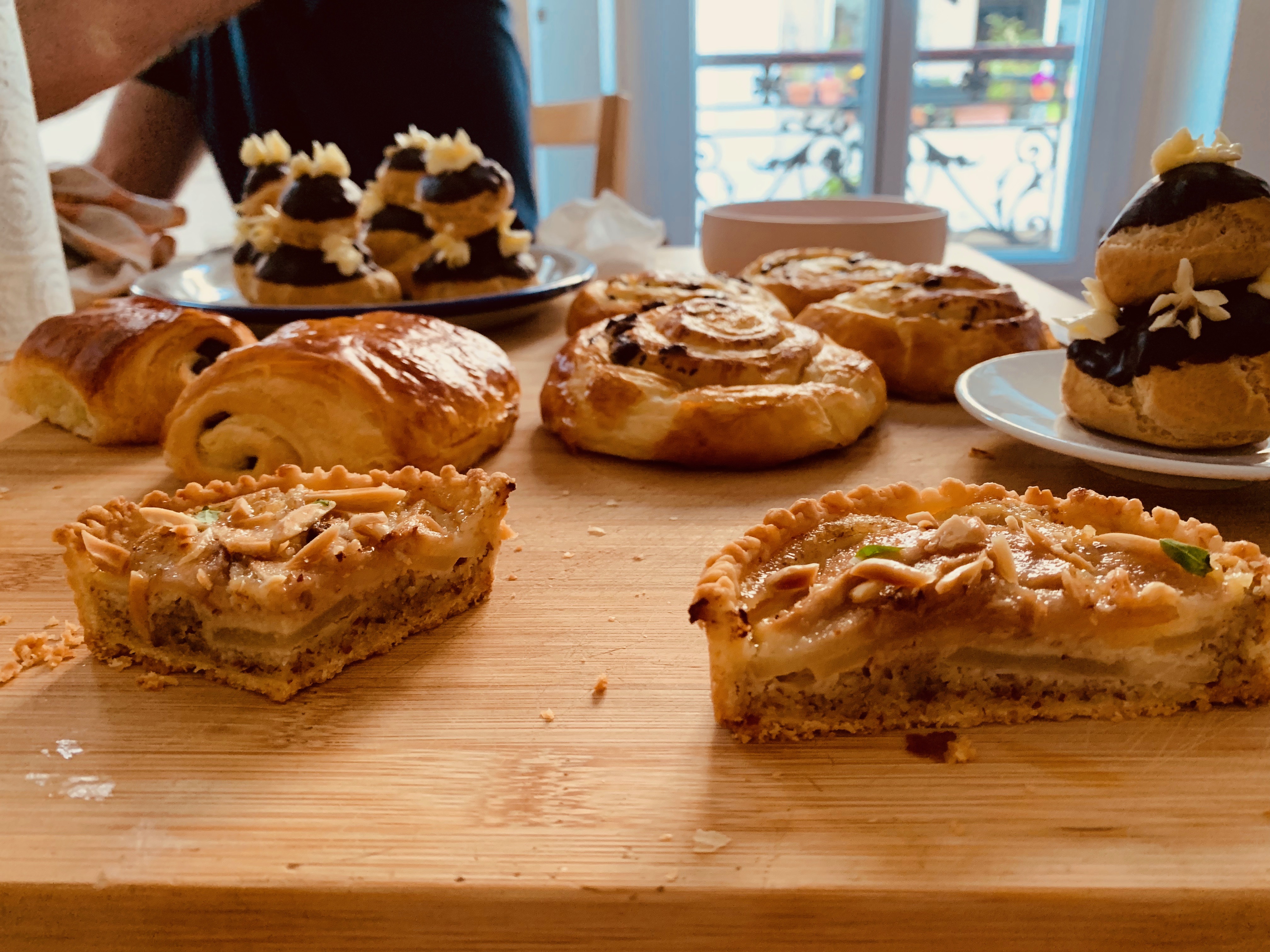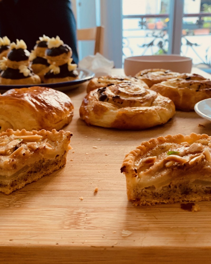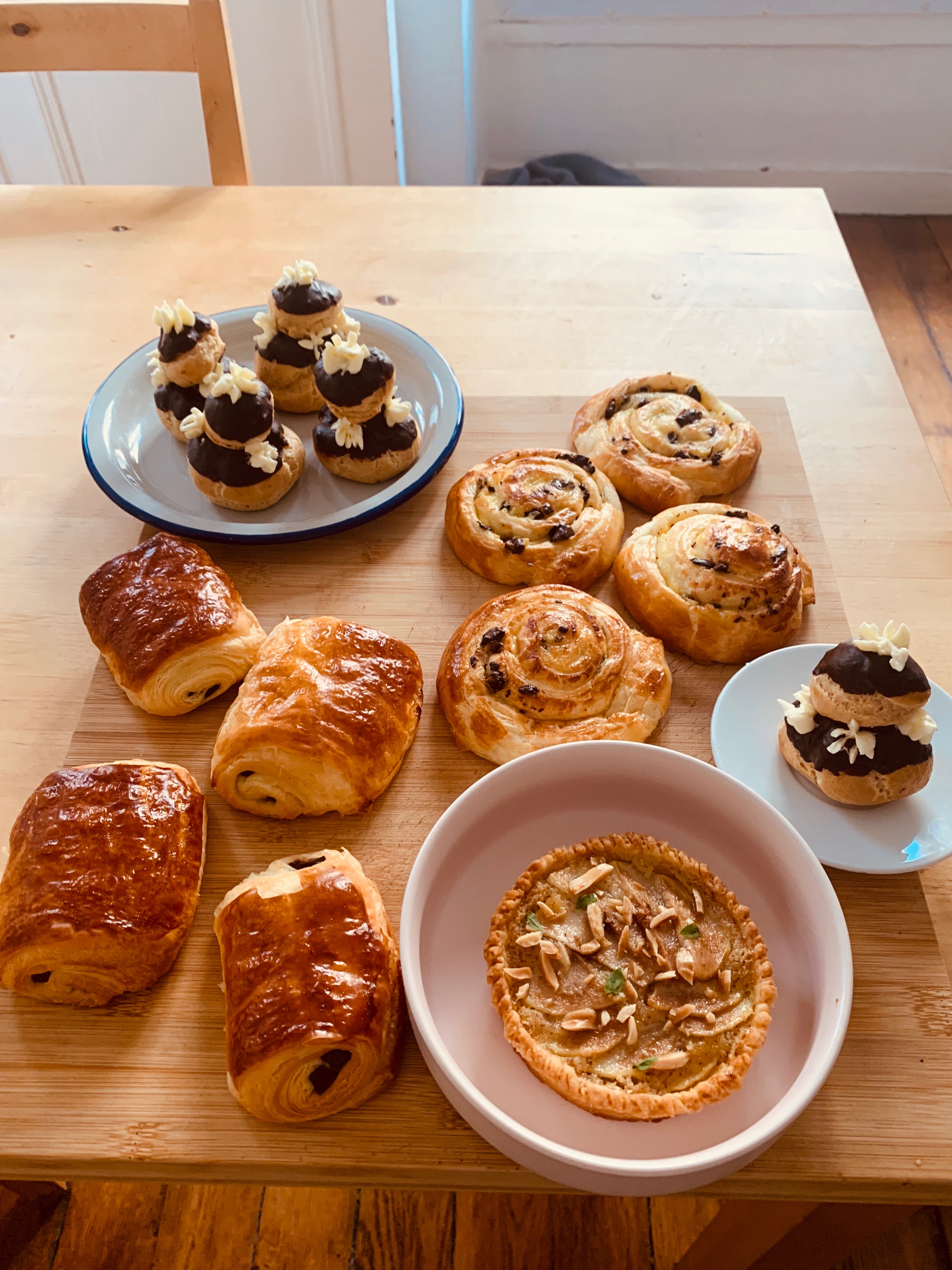 pain au chocolat, tartelette bourdaloue, religieuses au chocolat