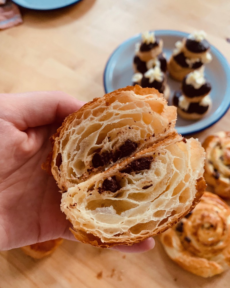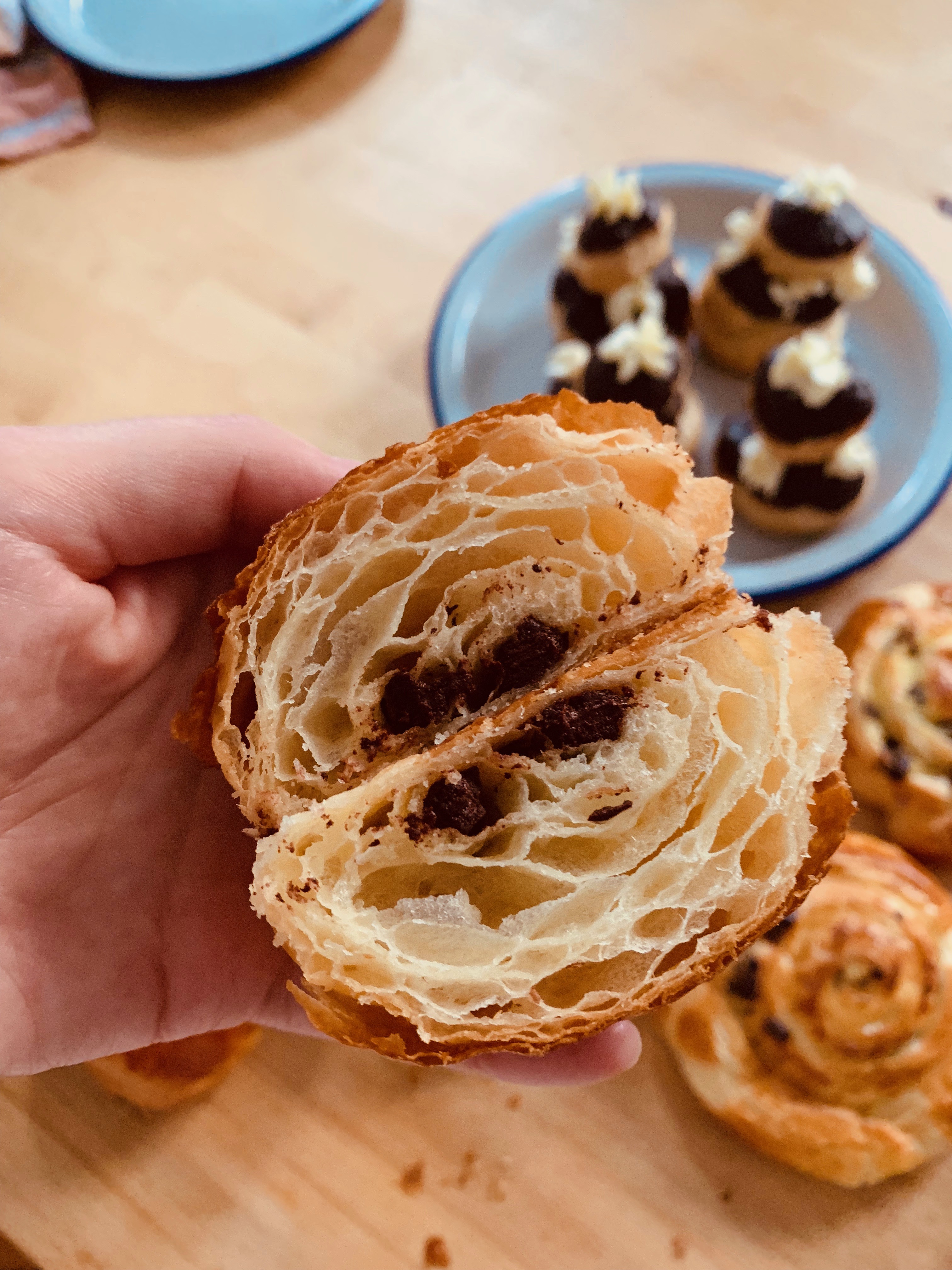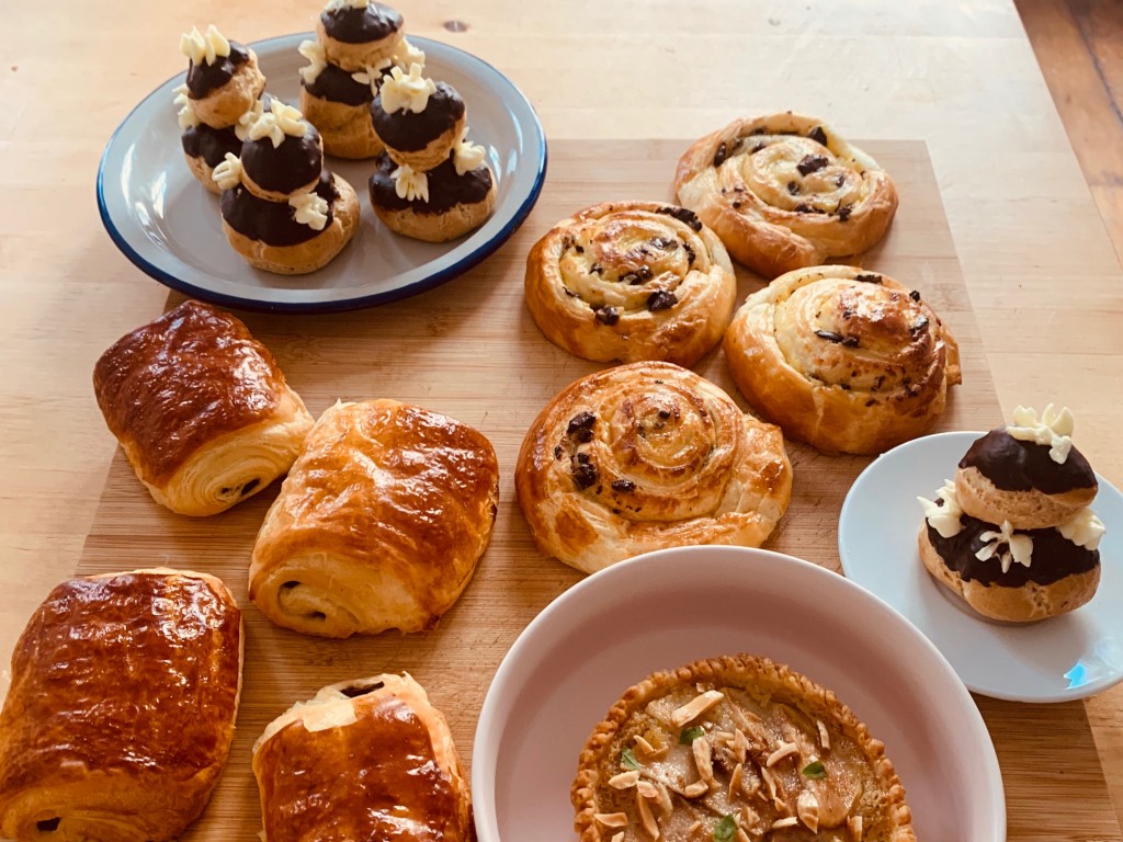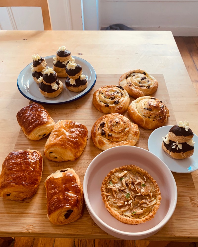 pain au chocolat, tartelette bourdaloue, religieuses au chocolat